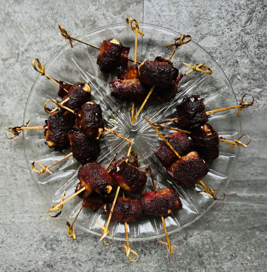 Preheat the oven to 425 F. Cut the bacon strips in half crosswise. Separate each date in half lengthwise and fill each with one-half teaspoon of cream cheese. Wrap each date tightly with a half strip of bacon and set aside. On a small plate or shallow bowl, mix together the brown sugar, cocoa, chili powder, and cinnamon, then dip each bacon-wrapped date on both sides in the sugar mixture. Secure each bacon-wrapped date with a toothpick or skewer. Transfer the dates to a parchment-lined cookie sheet and bake for 15 to 30 minutes, or until the bacon is crisp; thicker bacon will take longer to cook.