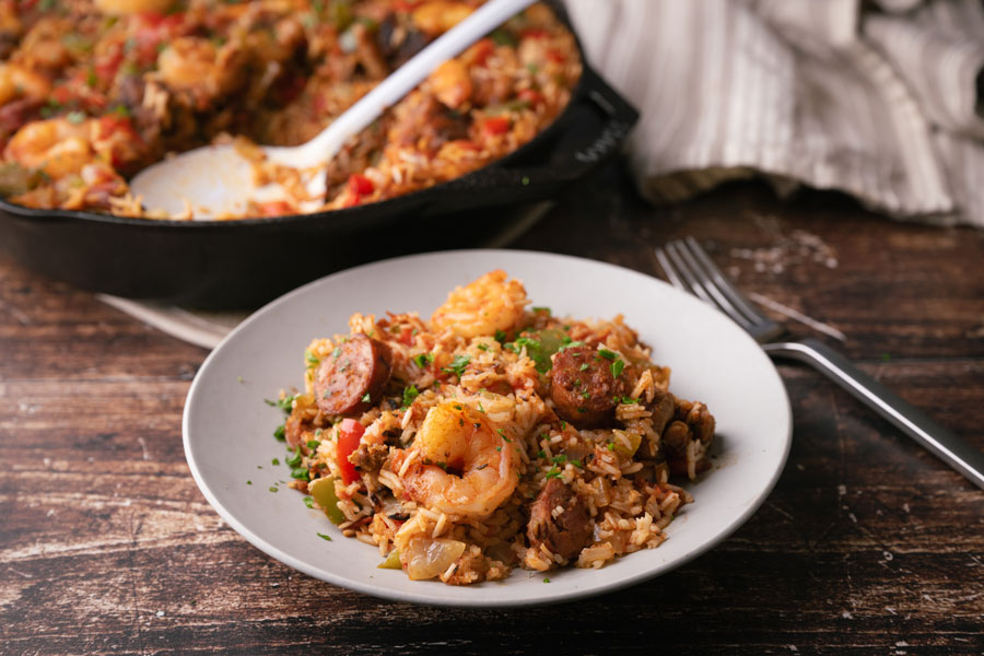 In a large skillet over medium-high heat, heat the oil and cook the chicken until browned and the internal temperature reaches 165 F, then remove from the skillet and set aside. Add the andouille sausage to the same skillet and cook until browned, then remove and set aside with the chicken. Thaw the shrimp under cold running water and set aside. Reduce the heat to medium, add the butter and flour to the skillet, and stir continuously while scraping up the browned bits from the bottom of the pan to form a roux. Add the onion, green onions, garlic, celery, and bell pepper and sauté for about 3 minutes, until softened. Stir in the basil, Cajun seasoning, salt, black pepper, cayenne pepper, and diced tomatoes, then add the chicken broth and rice and bring the mixture to a boil. Return the chicken, sausage, and shrimp to the skillet, reduce the heat to low, cover, and simmer for 20 minutes. Remove from the heat and let rest, covered, for 10 minutes, then fluff with a fork and let stand for an additional 5 minutes before serving.