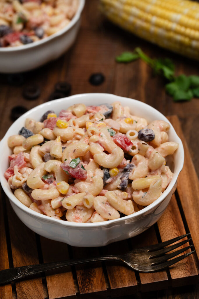 Preheat oven to 400 F. Cover a rimmed baking sheet with aluminum foil. Coat with olive oil. Roll the ears of corn in the olive oil to coat and place on the baking sheet. Roast for 15-20 minutes, flipping halfway through. Cool and cut the corn kernels off of the cobs and transfer to a large bowl. Then add the cooked noodles, red onion, tomatoes, black olives and black beans. Gently combine all ingredients. To make dressing, in a small bowl, combine all ingredients until blended. Pour the dressing over the salad and gently mix to combine and coat. Cover and chill at least one hour. Refrigerate leftovers up to 2 days.
