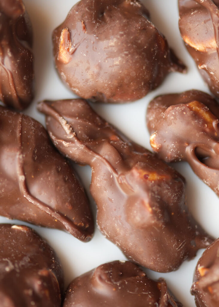 In a slow cooker, layer the peanuts, chocolate chips, peanut butter chips and bark. Cook on low 1 hour, stirring every 15 -20 minutes. Once all is melted, stir the mixture to combine. Use a spoon or scoop and transfer to a cookie sheet lined with parchment paper or wax paper. Let cool for 1-2 hours.